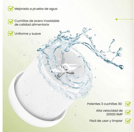 Es recargable y perfecta para llevarla contigo a todos lados La parte inferior cuenta con motor y cuchilla de acero para mezclar todos tus ingredientes de forma práctica y rápida.